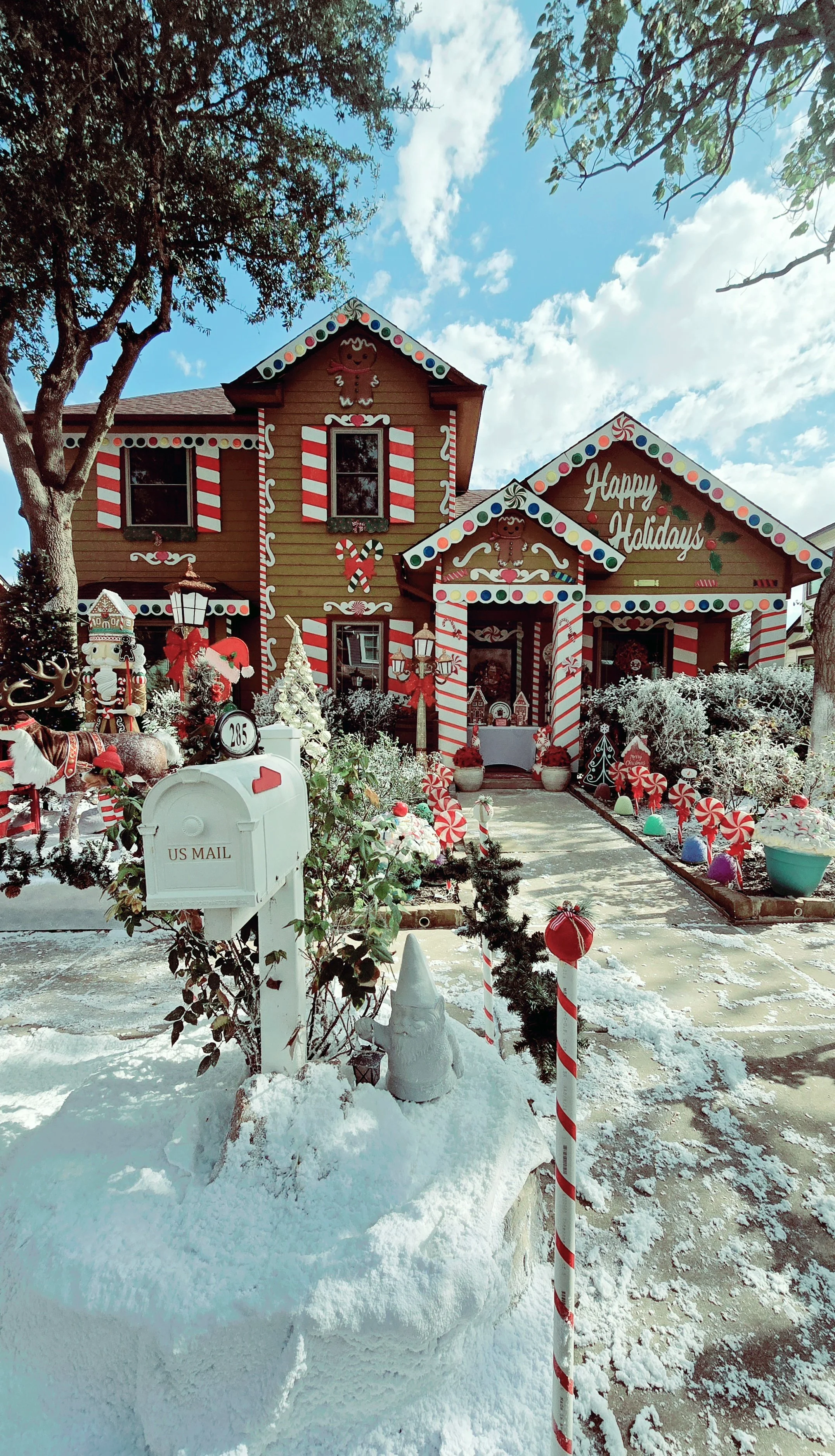 In 2020, during the height of the Covid19 Pandemic, Kristine began constructing humongous gingerbread-like decorations to decorate the exterior of her house to make it resemble a life-sized gingerbread house. Her goal was to bring joy and holiday cheer to her neighbors in her community during what was globally, a very challenging time.